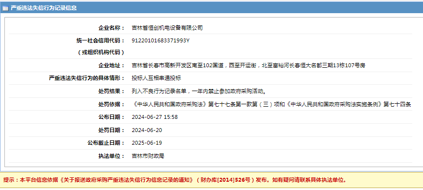 6月27日,根据政府采购网公示,吉林省恒创机电设备有限公司投标人互相串通投标。