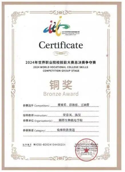 依托学校老中青梯次配置的专业教师团队,彭海霞在班主任的细心呵护下,秉持“勤学笃行、精益求精”的治学态度,积极投身实训教学与技能竞赛,专业素养与实操能力同步精进。2024年,她在湘潭市职业院校技能竞赛中崭露头角,成功入选湖南省代表队,赴重庆荣昌参加世界职业技能大赛农林牧渔行业赛,与全球顶尖选手同台竞技,凭借扎实的专业功底与出色的临场应变能力荣获团队铜牌;2025年,她再添殊荣,先后斩获“一带一路暨金砖国家技能发展与技术创新大赛”优秀奖、国家奖学金及湖南省 “三好学生”荣誉称号,成为中职学子全面发展的典范。